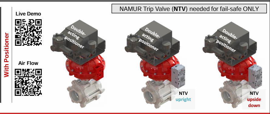 ECAs and EVAs will work with any positioner in the market. Regardless of double-acting or fail-safe setup, user must use a double-acting positioner. Installing or not installing Easytork’s NAMUR Trip Valve (“NTV”) with a double-acting positioner determines what function (fail-safe, in CW or CCW, or double-acting) the actuator has. Any 4-20ma or 3-15 psi positioner in the market works with the system. NTV removes integration complexity between actuator, positioner and air reservoir. In most instances, set-up is significantly easier and more economical than spring-return actuators. With Easytork’s built-in air reservoirs, system integrator only needs to connect signal source to positioner and supply air to Easytork’s system.